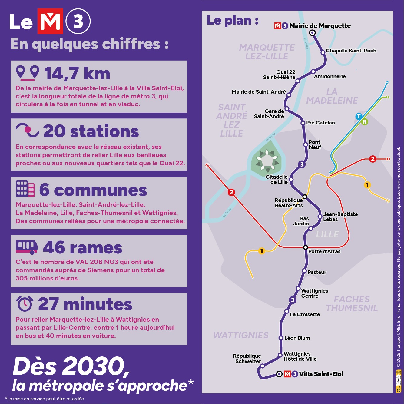Le projet est estimé à 1,8 milliard d'euros, co-financé par la MEL, l'État, la Région Hauts-de-France et l'Union Européenne. La M3 sera accessible avec les mêmes titres de transport ilévia que le reste du réseau — abonnement, trajet unitaire ou Pass 1 Jour.